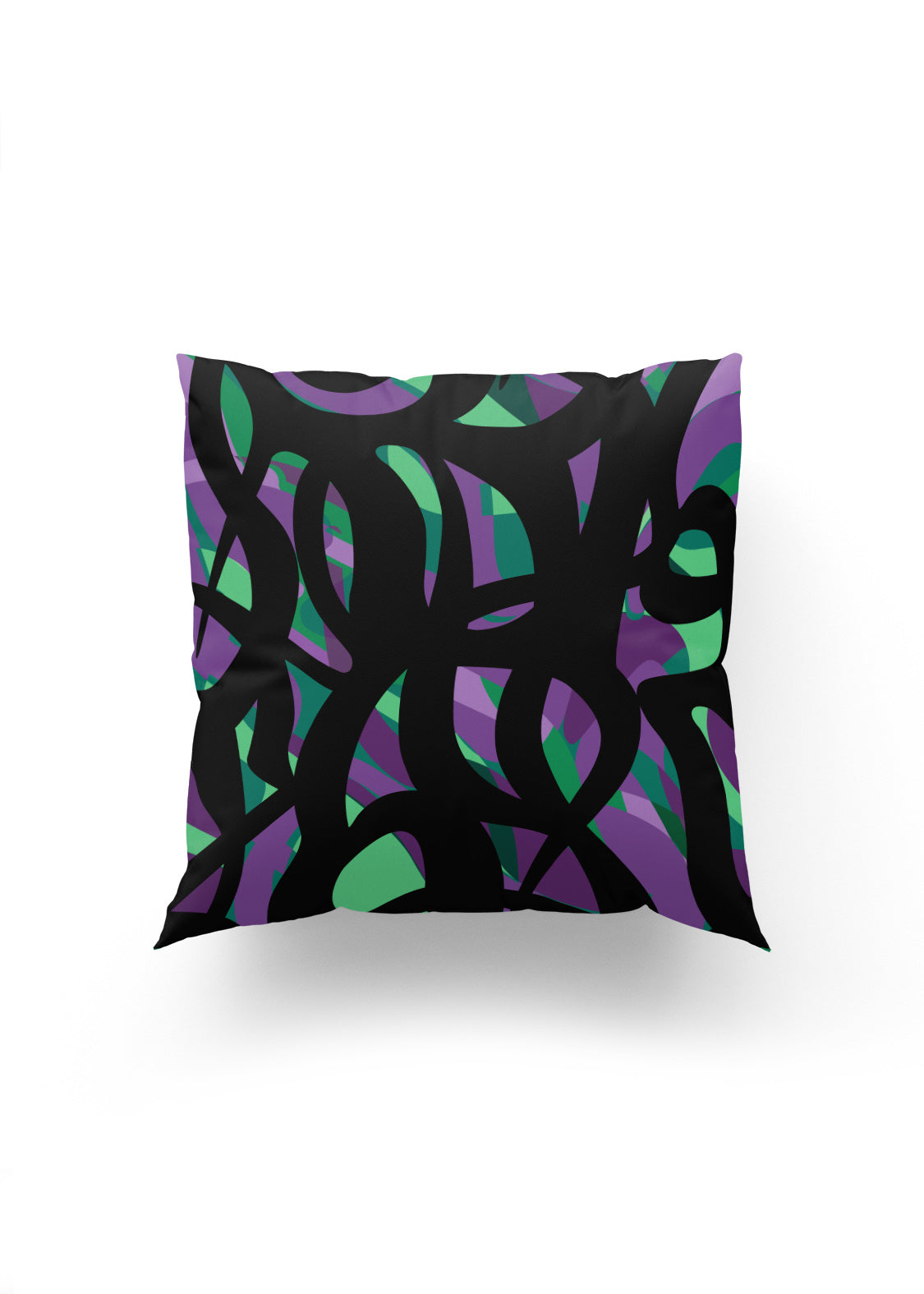 Yeşil ve Morun Enerjik Dansı – Siyah Zemin Üzerinde Soyut Desenli Kırlent Kılıfı